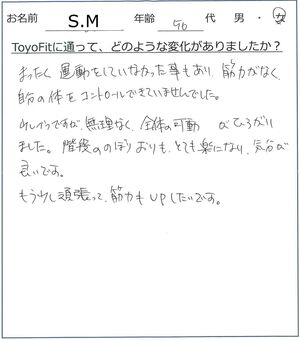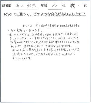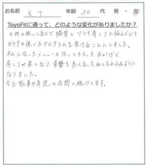 私のニーズ(主に肩甲骨まわりの動きを正常化)に合ったトレーニングメニューを組んでもらうことに加えて、トレーナーの指導のもとで行えるので、これまであまり運動をしてこなかった私でも、無理なく安心して取り組めております。