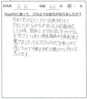 整体と、カラダの使い方プログラムを行い、1ヶ月で慢性腰痛から解放され驚きました。