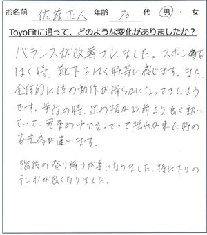 歩行の時、足の指が以前よりもよく動いていて、電車の中で立っていて揺れが来た時の安定感が違います。