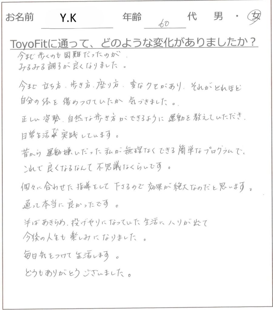 自分の体のゆがみやくせを分析いただいたお蔭で、意識を置くポイントに気を配るようになりました。